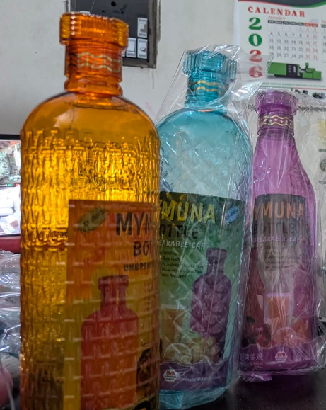 মাঝখানে কালো লেবেলযুক্ত বোতলটি "Mymuna Bottle Classic" ব্র্যান্ডের।